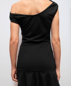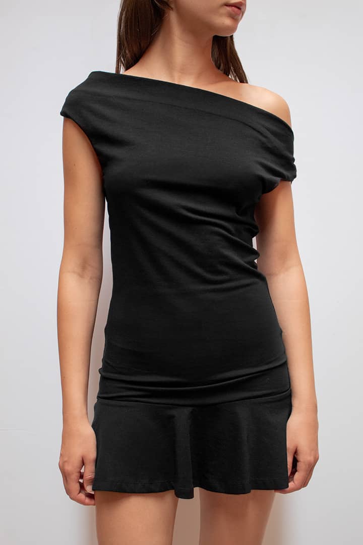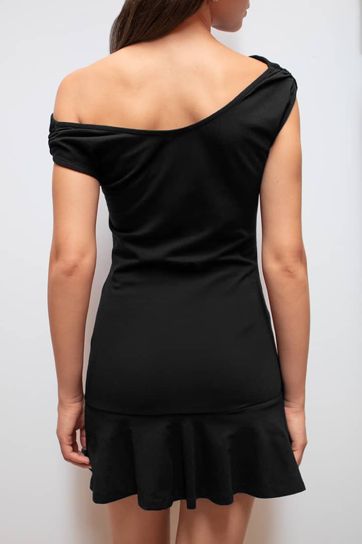 Asymmetric neckline dress, short sleeves, regular length, slim fit.