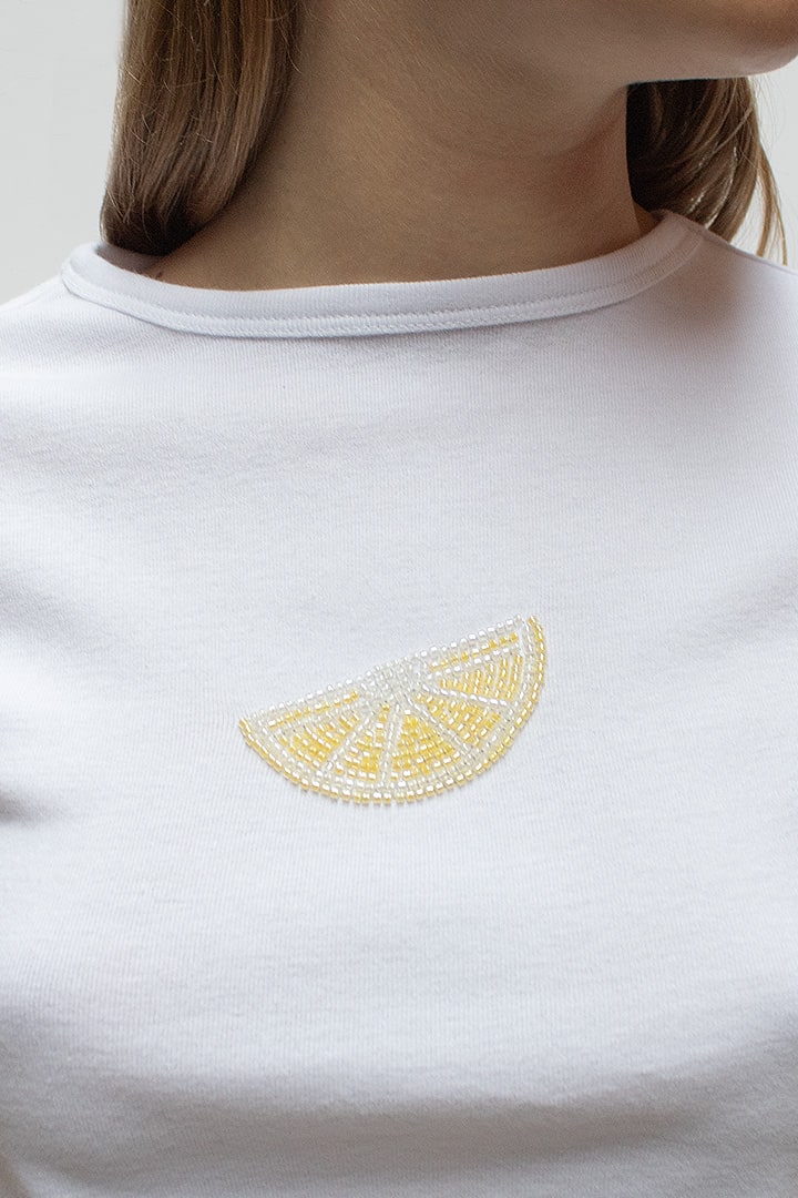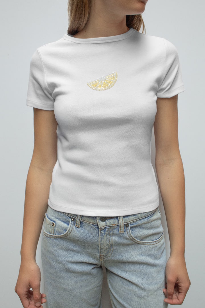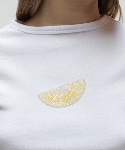 T-shirt with beaded lemon, crew neckline, short sleeves, regular length, relaxed fit.