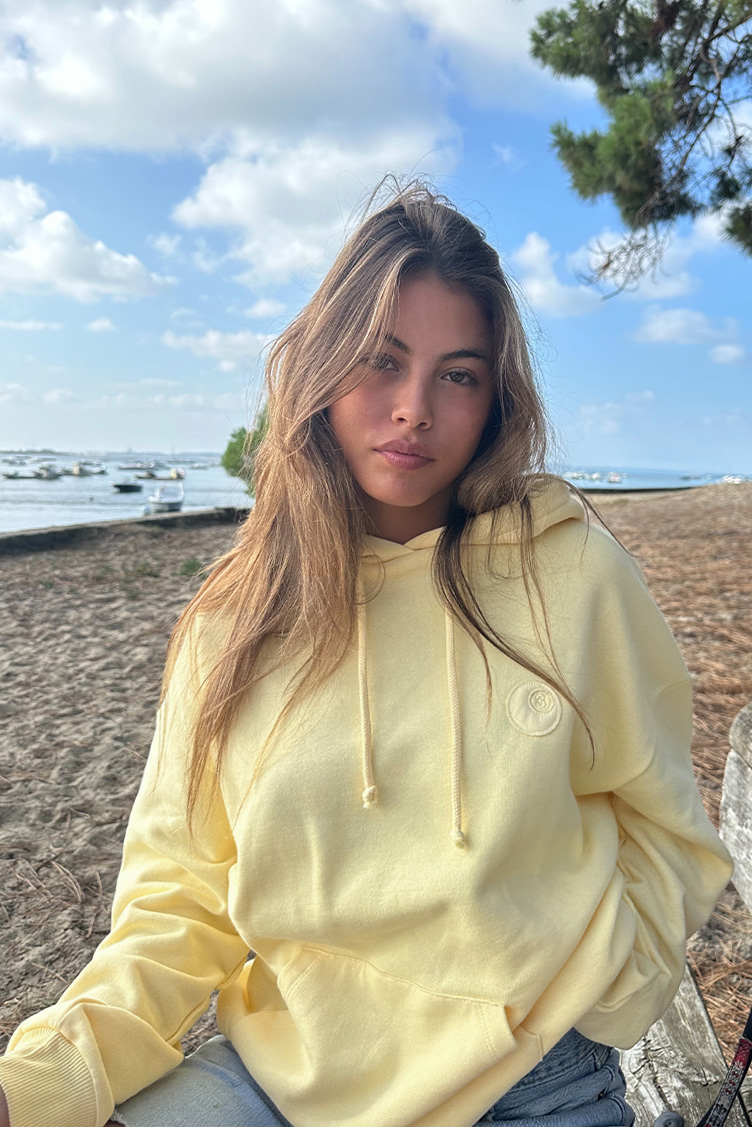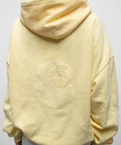 Hoodie with billiard ball patch, front pockets, long sleeves, long length, relaxed fit.