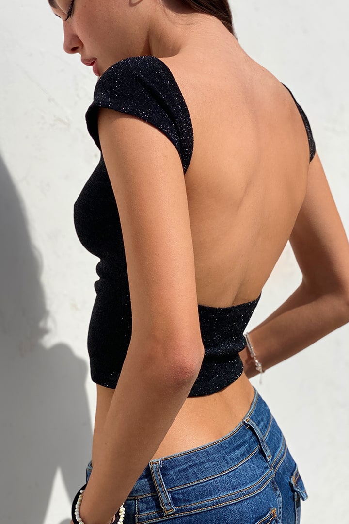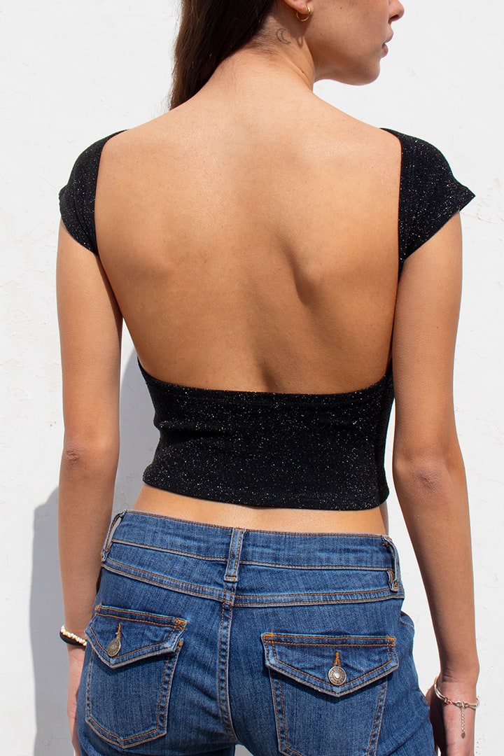 Sequin boat neck t-shirt, sparkly fabric, short sleeves, back uncovered, short length, relaxed fit.