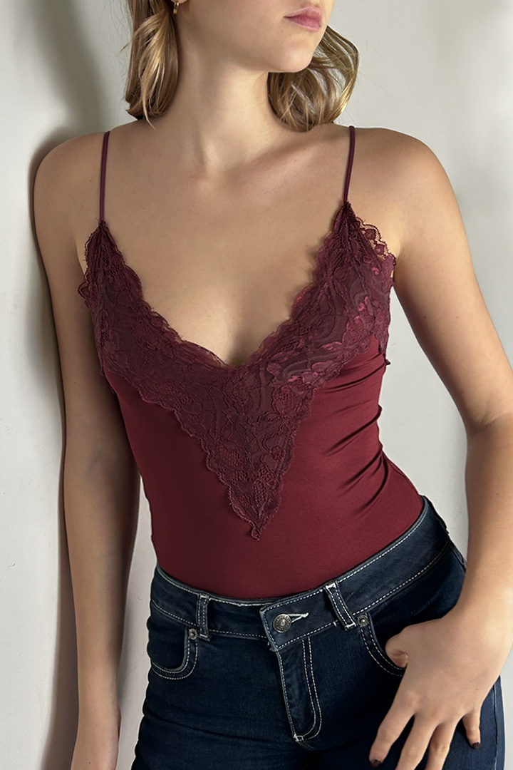 Lace bodysuit, deep V-neckline, sleeveless, lycra tactel fabric, snap button fastening, tight fit.