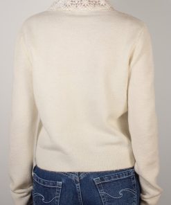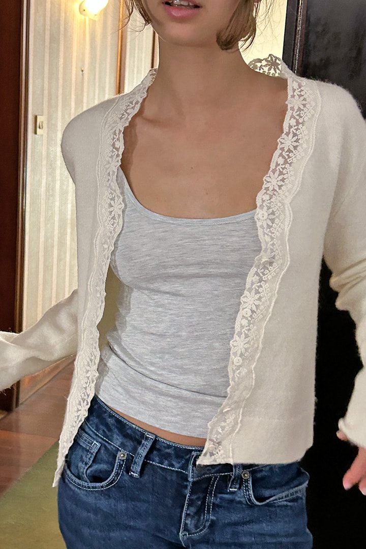 Lace cardigan, open front, long sleeves, regular length, relaxed fit.