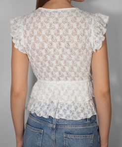 V-neck top, short sleeves, front tie fastening, lace fabric, with ruffle, regular length, tight fit.