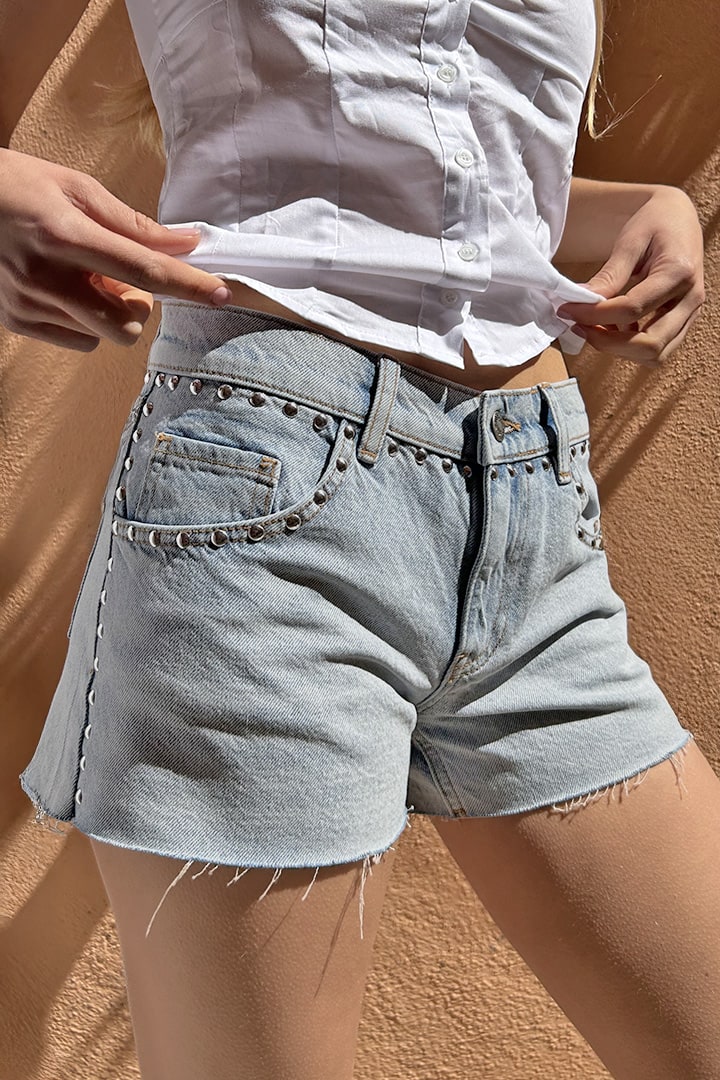 Shorts with studs, low waist, 4 pockets, belt loops, raw edge hem, button up and zip fastening, regular length, slim fit.