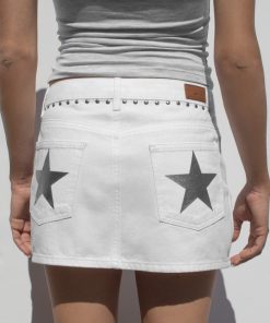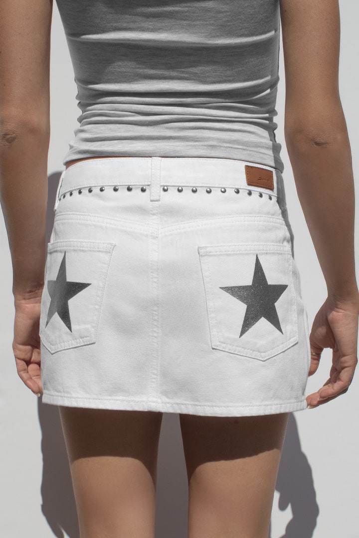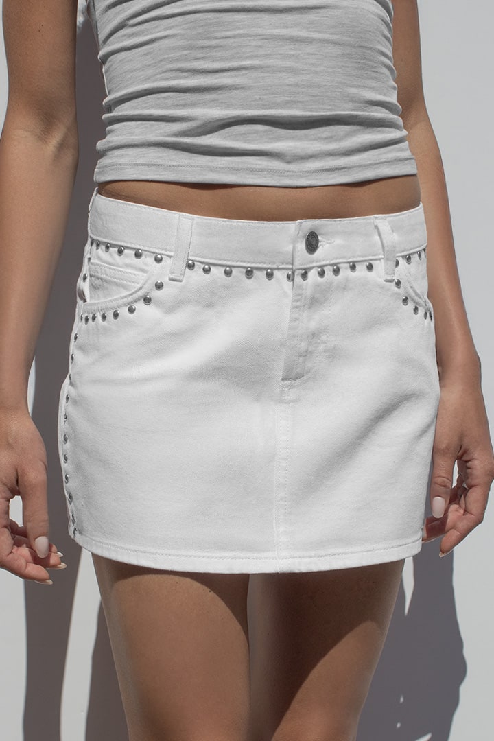 Low waist skirt, with studs, double button and zip fastening, belt loops, with pockets, short length, slim fit.