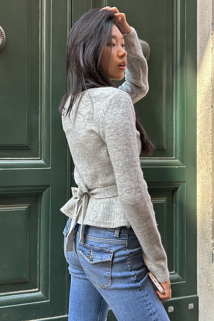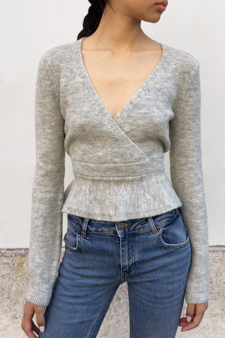V neck sweater, with ruffle hem, backlace-up detail, long sleeves, regular length, slim fit.