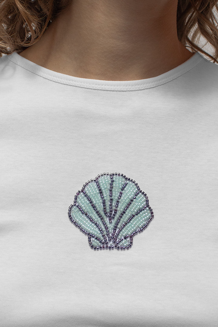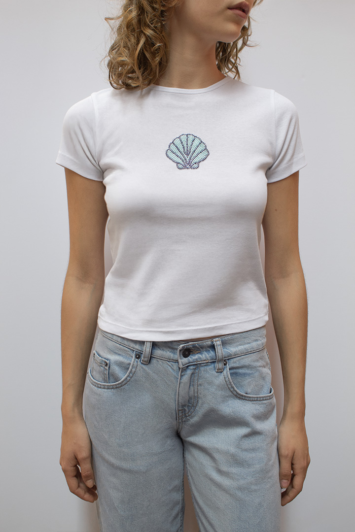 Beaded Shell T-shirt, crew neck, short sleeves, regular length, relaxed fit.