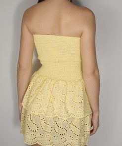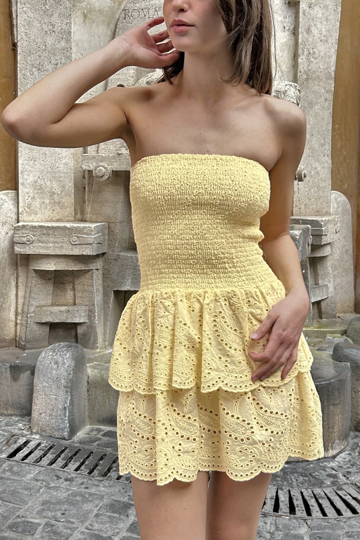 Shirred dress, sleeveless, with double ruffle, short sleeves, tight fit.