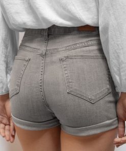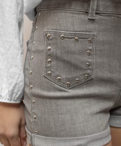 Shorts with pockets and studs, low waist, front pockets, belt loops, turn-up detail, short length, slim fit.