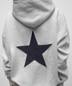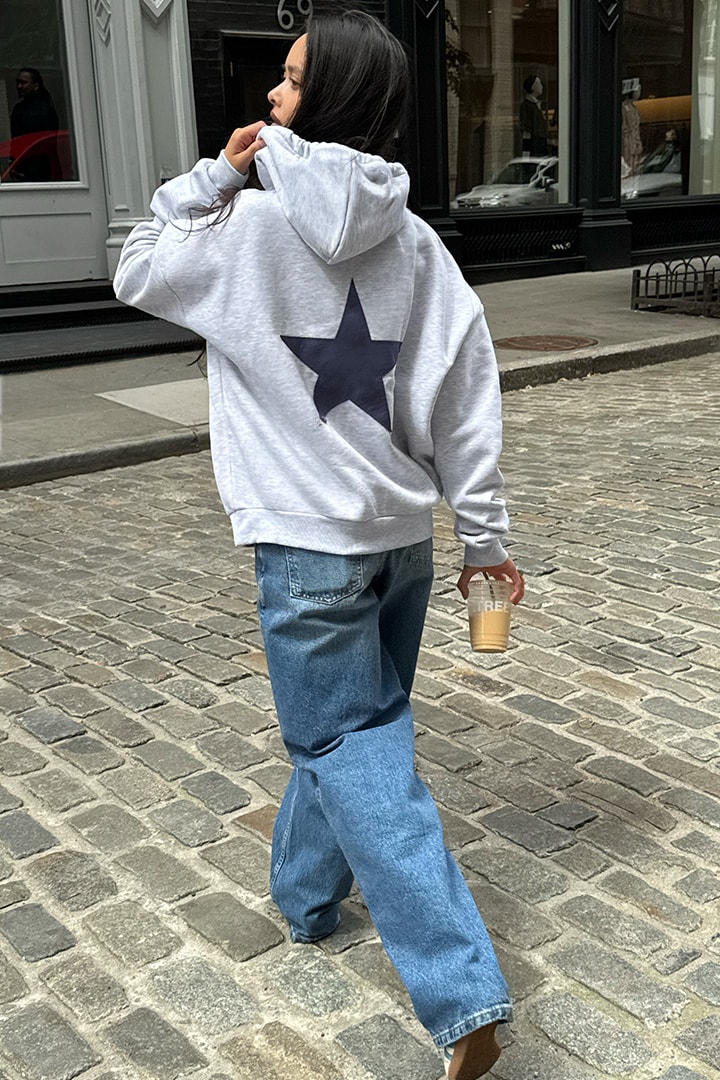Hoodie with star patch, front pockets, long sleeves, long length, relaxed fit.