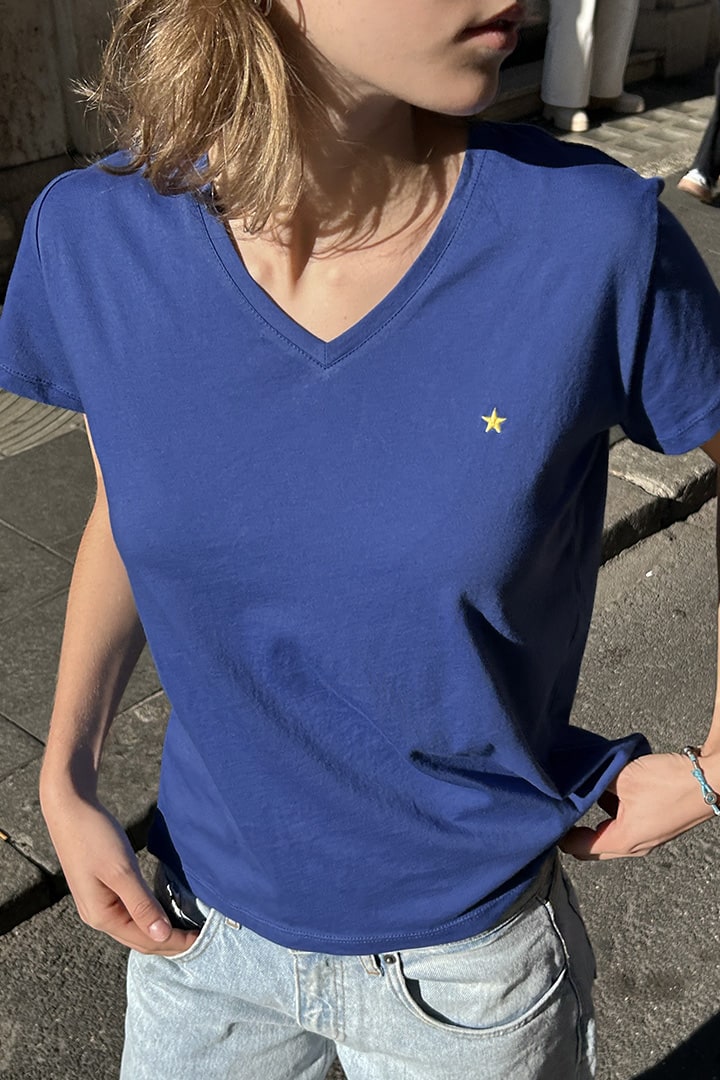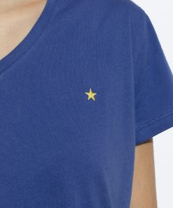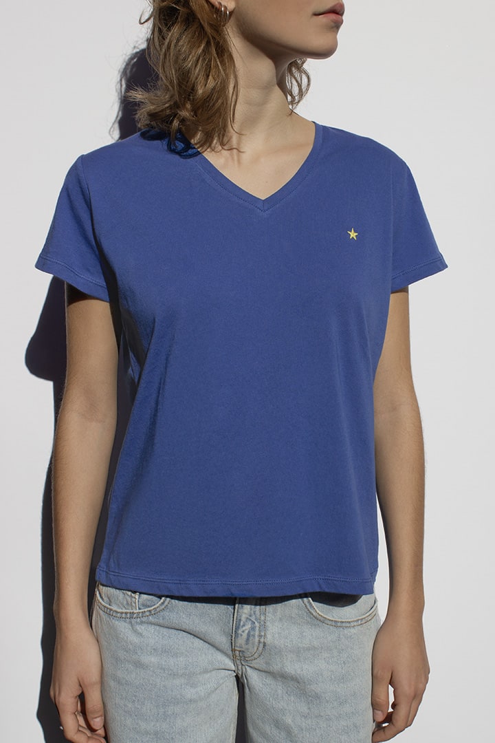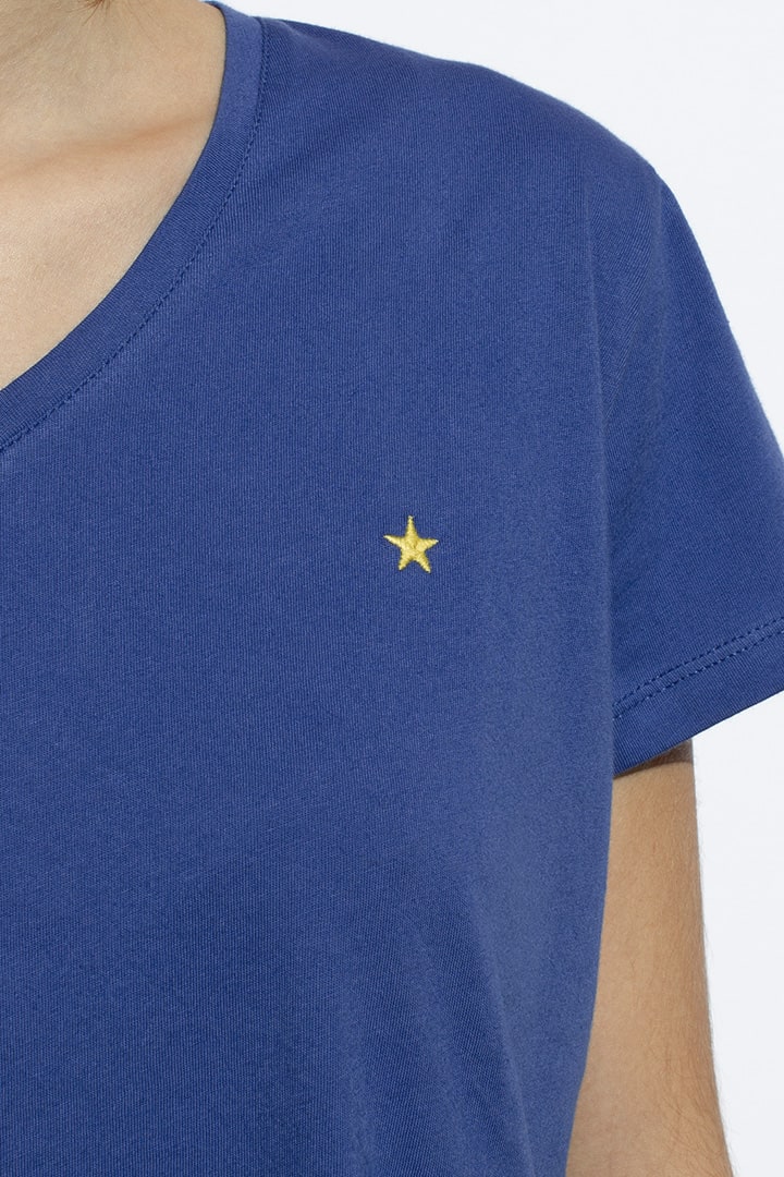 T-shirt with star embroidery, v neckline, short sleeves, regular length, relaxed fit.