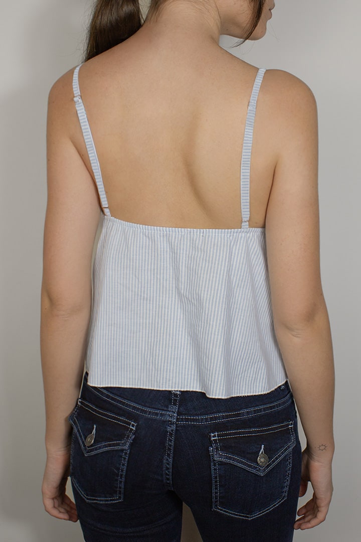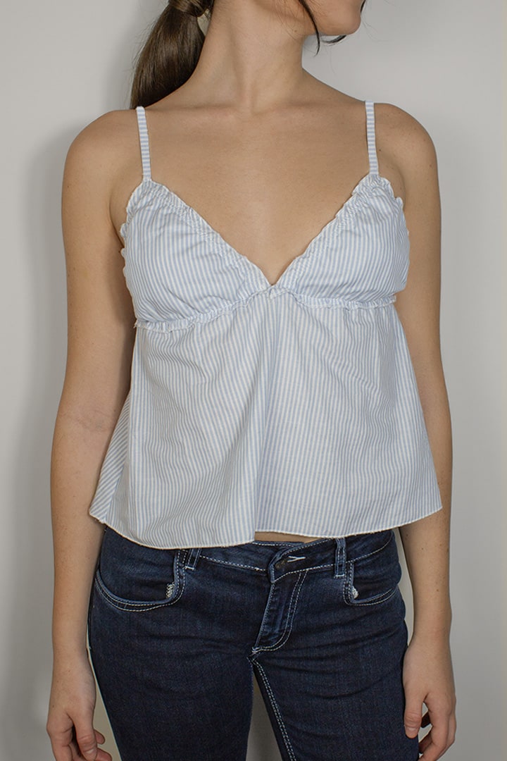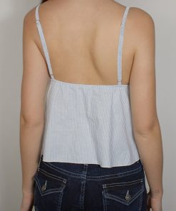 Top with ruffles, striped pattern, V neckline, sleeveless, with adjustable shoulder straps, regular length, relaxed fit.