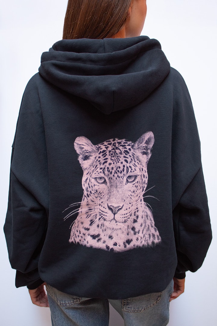 Hoodie with Wild Baby and tiger print, front pockets, long sleeves, long length, relaxed fit.